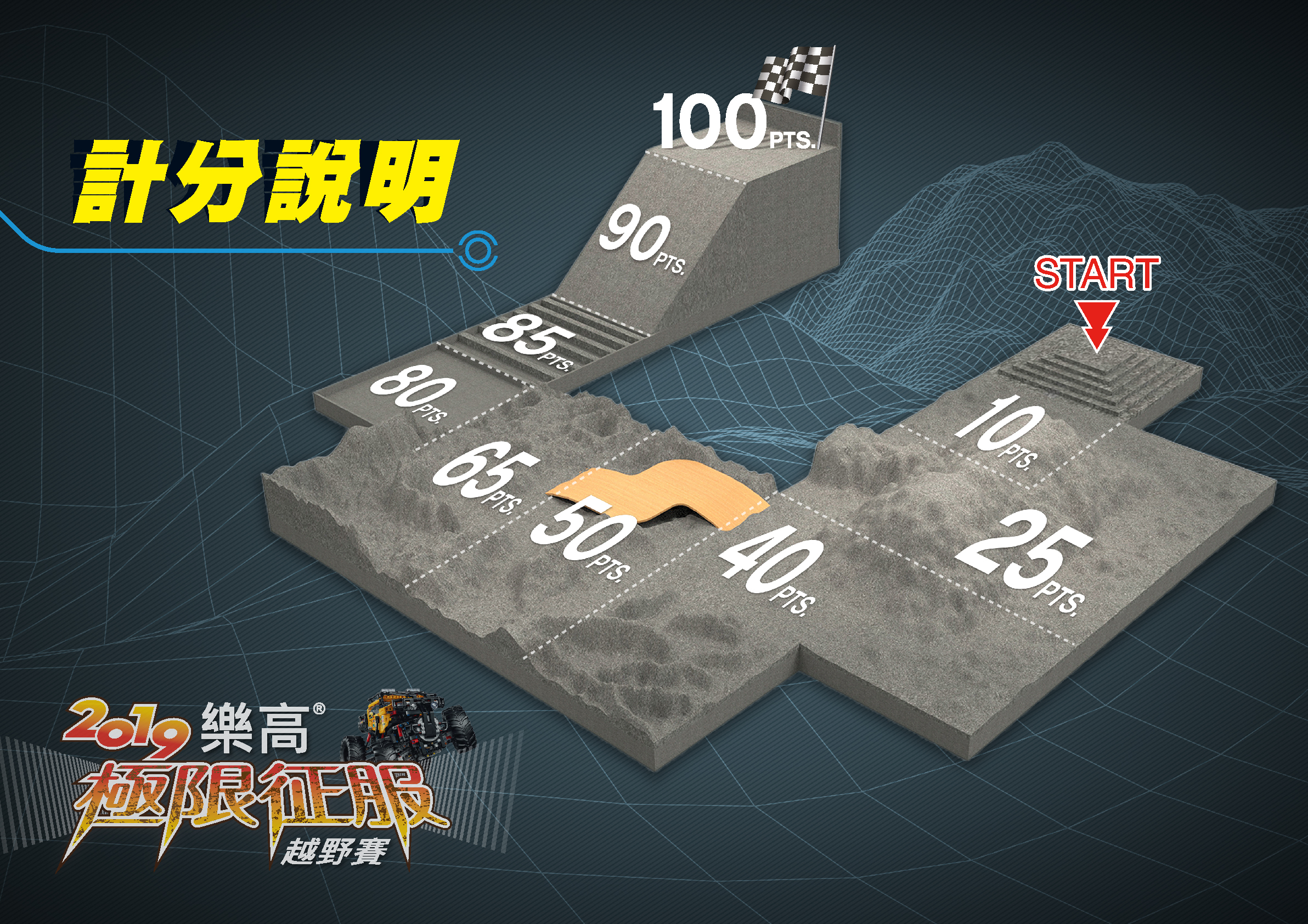 離開出發區後(10分)首先遇到的是一座高山,高山的右側有一小山丘需要翻越,從這裡走你可以快速的穿越這個區域。(25分)但是請注意!這座小山丘可不是可以隨隨便便讓你爬到它頭上的~想走保險的路線,可以選擇從高山的左側繞過它,這考驗著你的過彎技巧以及克服崎嶇路面的能力。(40分)之後緊接著要作出抉擇,要走暗藏陷阱的閃電橋?還是考驗性能的山谷賽道?(50分)好不容易過了閃電橋,馬上要面臨掉進彈坑的危險!要是選擇山谷賽道,也要面臨要靠技巧突破的彎道。(65分)經過了重重難關終於到了比較可愛的積木池(80分),但後方接著危機四伏的減速區(85分),你能一舉突破嗎?賽道末端是最考驗性能的40度上坡(90分),努力爬上去,獎盃就在跟你招手啦~(滿分100分)