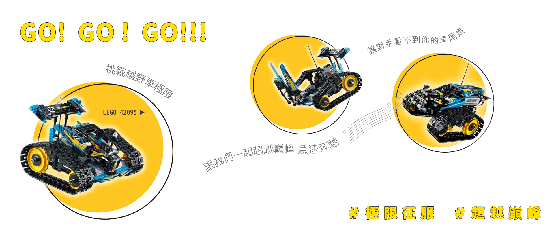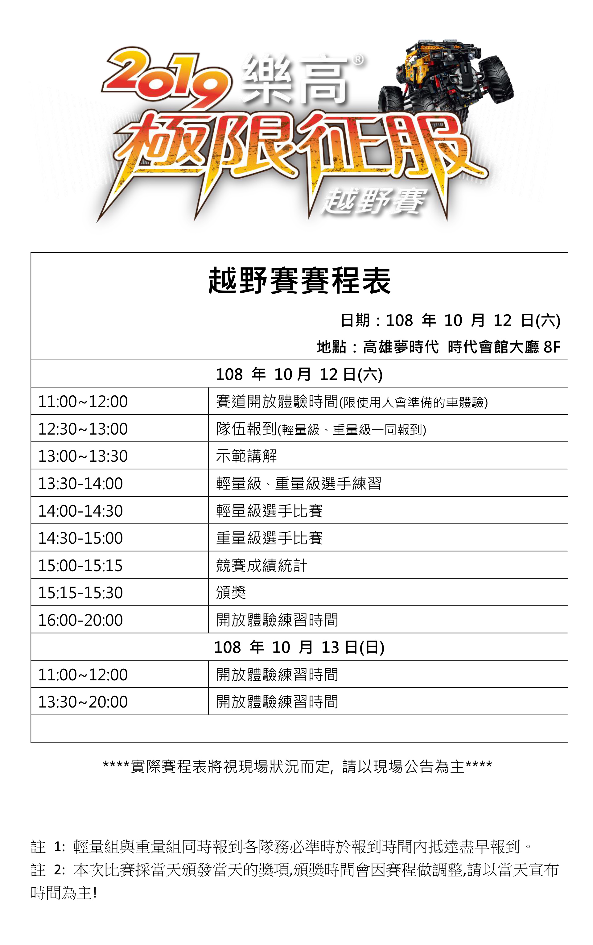 越野車必須在不出界、不翻車,動力輪皆接觸場地的情況車體完全「進入」記分區才算得分,部分高難度賽區配分較高,計分說明呈現的數字為成功進入該區域所得到的相對分數,不同路線完成完整賽道之積分皆為滿分100分。 (**80分區於比賽時會鋪滿樂高積木;90分區為45度角斜坡**)
